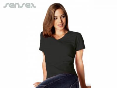 We can embroider the promotional frauen-t-shirts mit v-ausschnitt with your company logo. The exact cost of the embroidery will depend on how large the embroidered area of your logo is. Sometimes logos are too detailed to enable us to effectively embroider them onto the frauen-t-shirts mit v-ausschnitt, as the stitching will simplify your logo so that any fine detail will be lost or can simply not be achieved.