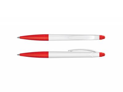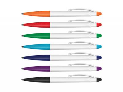 Twist Aktion Kugelschreiber aus Kunststoff mit einem weißen Lauf und einem Stift für die Verwendung mit Touchscreens. Es hat eine schwarze Tinte nachfüllen mit 500 Meter von Tinte zu schreiben und eine Hartmetallkugel für eine verbesserte Schreibqualität. Perfekt für Konventionen! [Liste] Produkteigenschaften: