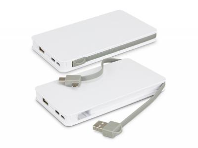 Die Colton Wireless Charging Power Banks sind eine neue Wave Wireless Charging Power Bank, mit der zwei Geräte gleichzeitig aufgeladen werden können. Geräte, die für das kabellose Laden aktiviert sind, werden aufgeladen, indem sie einfach auf die Power Bank gelegt werden. Es bietet auch konventionelles Aufladen für fast jedes Telefon mit einem Wickelkabel, das gut in das Gehäuse passt. Es hat einen Typ-C-Anschluss und einen einzigartigen doppelseitigen Anschluss mit Lightning auf der einen Seite und Micro-B-USB auf der anderen Seite. Das Kabel wird auch zum Aufladen der Power Bank über einen USB-Anschluss oder ein Netzteil verwendet. Colton verfügt über eine Speicherkapazität von 5000 mAh, eine Eingangsleistung von 5 V / 2A und eine Ausgangsleistung von 5 V / 2,4 A. Es wird in einer weißen Schachtel mit einer Gebrauchsanweisung geliefert und auf Anfrage ist eine optionale EVA-Tragetasche erhältlich. Branding: Vollfarbdruck - Energiebank - 126 mm x 62 mm. Der Preis beinhaltet einen Vollfarbdruck, 1 Position.