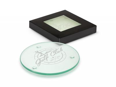 Round Clarity Glasuntersetzer Sets area a Set bestehend aus zwei runden Glasuntersetzern in einer eleganten schwarzen Geschenkbox mit einem Fenster, das die Marke in Szene setzt. Abmessungen: Untersetzer: 89 mm x 4 mm Durchmesser. Geschenkbox: B 92 mm L 92 mm x 15 mm. [Liste] Branding-Optionen