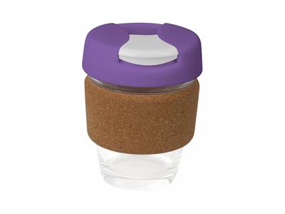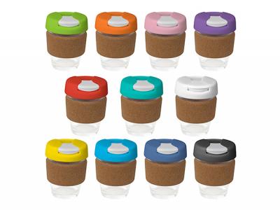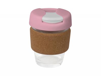 - Werbeartikel Eco Flip Deckel Glas Kaffeetassen mit Korkbändern (320ml)