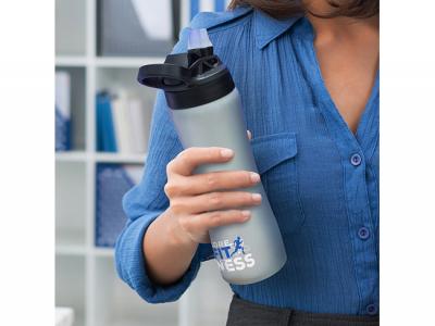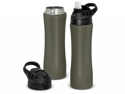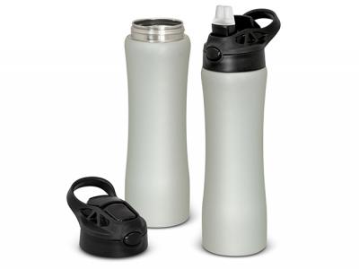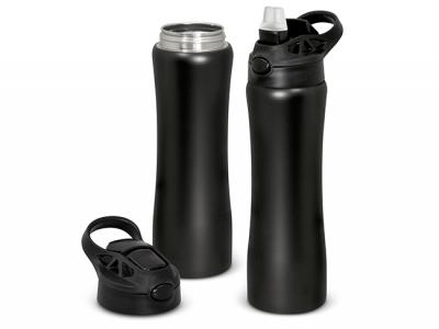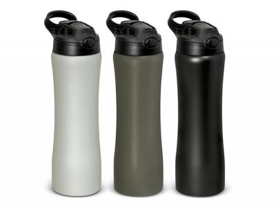 These sophisticated stainless steel water bottles feature a lacquered matt finish and a contoured design that ensures that these promotional drink bottles are comfortable to hold for hands of all sizes. They have a secure screw on lid with a carry handle and a push-button activated drinking straw that locks away when not in use to protect it from dust and dirt.