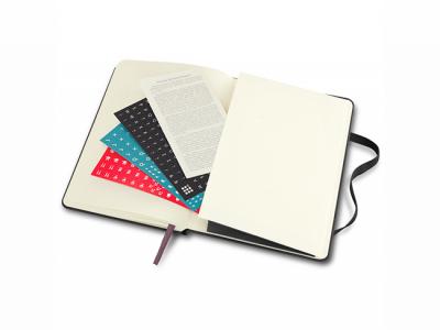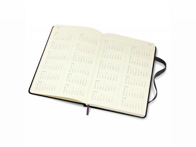 The classic hardcover A5 planner includes ivory-colored paper with rounded edges, a bookmark ribbon, and an elastic closure for added privacy. An expandable back pocket offers storage for notes and includes the history of Moleskine, along with three pages of adhesive flags for marking important dates and events.