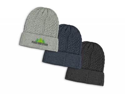 We can embroider the promotional chunky cable knit beanies with your company logo. The exact cost of the embroidery will depend on how large the embroidered area of your logo is. Sometimes logos are too detailed to enable us to effectively embroider them onto the chunky cable knit beanies, as the stitching will simplify your logo so that any fine detail will be lost or can simply not be achieved.