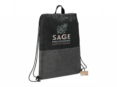 These custom printed recycled drawstring bags feature a cinch closure with a vertical zippered front pocket. They are eco friendly and made from recycled water bottles.