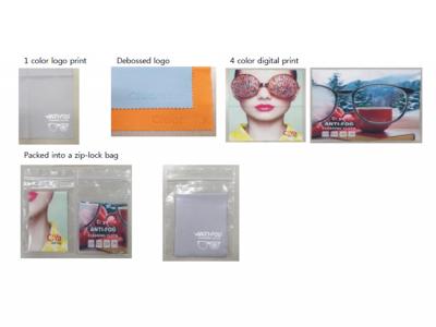 We can emboss your logo into the promotional microfiber anti fog lens cloths (250gsm). Embossing is similar to a stamping process. An extra cost may apply to get your microfiber anti fog lens cloths (250gsm) embossed.
