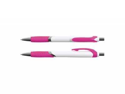 Diese Druckkugelschreiber werden mit schwarzer Tinte geliefert und verfügen über einen weißen Schaft mit verchromtem Knopf, Spitze und Markierungsring. Das Highlight sind die farblich passenden Clips und Griffe.