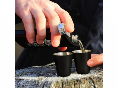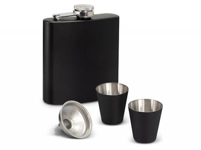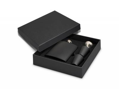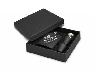 Diese Premium- und kundenspezifischen Geschenksets werden mit einem 170-ml-Flachmann aus Edelstahl, zwei Schnapsgläsern und einem Trichter geliefert. Alles wird schön in einer schwarzen Geschenkbox präsentiert.