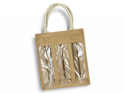 Diese Weintragetaschen für drei Flaschen mit individuellem Markenzeichen werden aus laminierter natürlicher Jute mit ungebleichten Baumwollgriffen hergestellt und verfügen über eine durchsichtige PVC-Frontplatte.