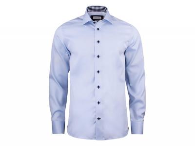 Stilvolle Langarm-Herren- und Damen-Dress-Hemden in einer einfarbigen Ausführung, gestaltet mit einer knitterfreien Oberfläche, die am Kragen und den Manschetten ein kontrastierendes Karomuster aufweisen und akribisch aus hochleistungsfähigem Twill-Gewebe gefertigt sind. Erhältlich in Größen von S bis 3XL für Herren und Damen.