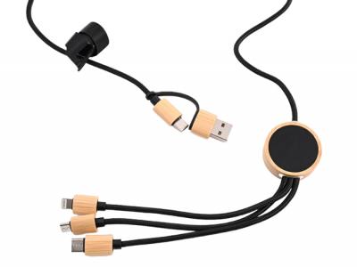 Eine elegante und vielseitige gewebte 6-in-1-Ladelösung. Dieses schwarze, maßgeschneiderte Ladekabel mit umweltfreundlichem Bambusbesatz an den Steckern verbindet Stil und Nachhaltigkeit. Der runde obere Teil ist mit einer Lasergravur versehen und leuchtet mit einer versteckten weißen LED, wenn es angeschlossen ist. Mit einem Combo-USB-A/Typ-C-Anschluss an einem Ende und separaten Micro-USB-, 8-Pin- und Typ-C-Anschlüssen am anderen Ende ist es mit einer Vielzahl von Geräten kompatibel. Das Kabel ist ca. 1,2 m lang und wird mit einem Klettverschlussband geliefert, das die Organisation erleichtert. Hinweis: Dieses Kabel ist nur zum Aufladen gedacht und unterstützt keine Datenübertragung.