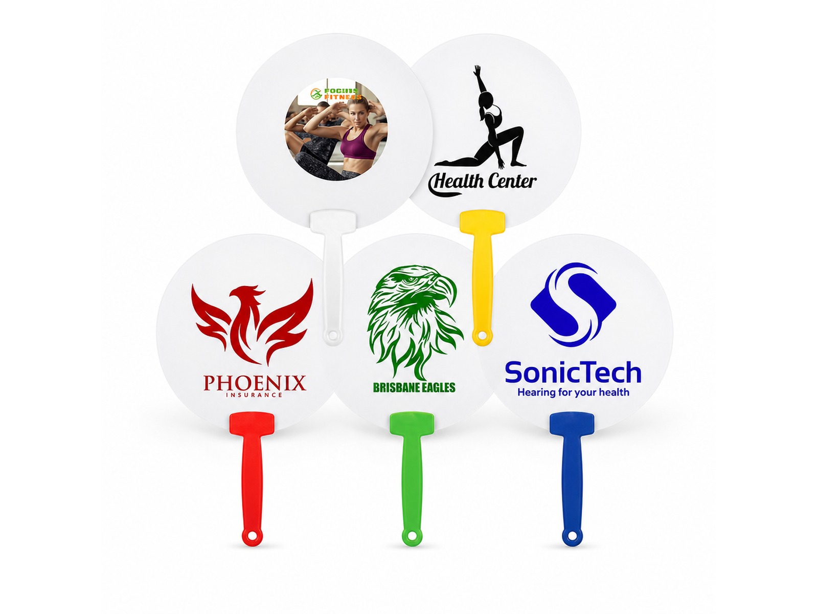 Your promotional fans can be silk screen printed in 1 or more colours. Costs shown include a 1 colour logo print on your custom branded fans. We can print more than 1 colour, however it incurs extra costs. We can achieve a perfect PMS colour match for the print.