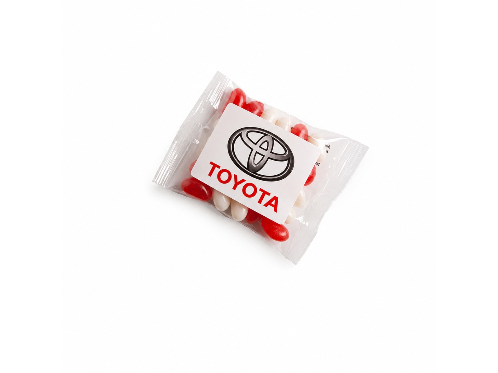 Your promotional jelly beans in logo farben can be silk screen printed in 1 or more colours. Costs shown include a 1 colour logo print on your custom branded jelly beans in logo farben. We can print more than 1 colour, however it incurs extra costs. We can achieve a perfect PMS colour match for the print.