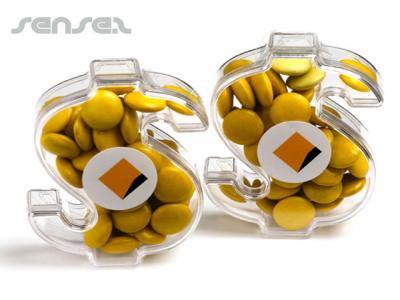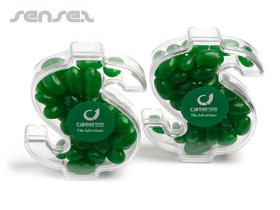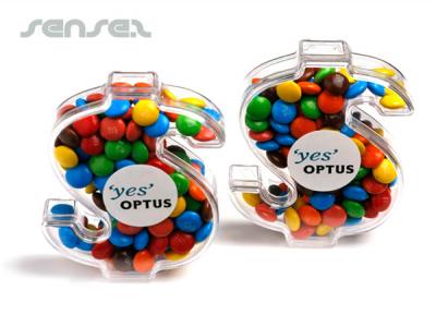 Dollar Shaped Box mit Ihrer Wahl von farbigen Gummibärchen, vermischt oder Sonderfarbe choc Bohnen, Pfefferminzbonbons oder Mini M & Ms gefüllt. Diese Dollar-förmigen klaren Acryl-Behälter sind für jeden Geld sparen Themen Produkt-Promotions, Hypothekenbanken oder Banken. Wählen Sie Ihre Farbe Schokoladenbohne oder Jelly Bean, um bis die Süßigkeiten mit Ihrem Firmen-Farbe. Dollar förmigen Lolly-Boxen sind mit einem Vollfarb-Digital-Aufkleber der Marke und sind eine perfekte Konferenz Geschenk.