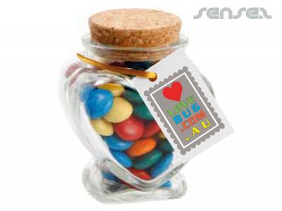 Our promotional heart candy jars are cute glass jars with a cork lids that are great for cute valentines giveaways and events.